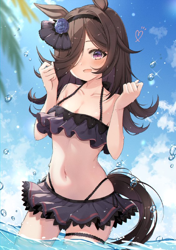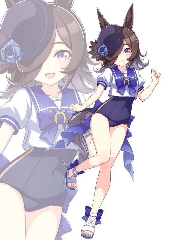 セーラー服にスク水を合わせた水着を着て髪の毛をショートヘアにしているライスシャワーを描きました!